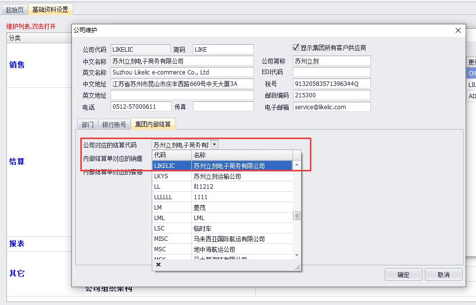 在:“系統-基礎資料設置-公司組織架構”界面,雙擊打開(kāi)某一家公司,如圖(2),切換到:“集團內部結算”界面,在“公司對應的結算代碼”中,選擇第1)步中,本公司名稱(chēng)在客戶(hù)供應商界面對接的代碼和名稱(chēng);