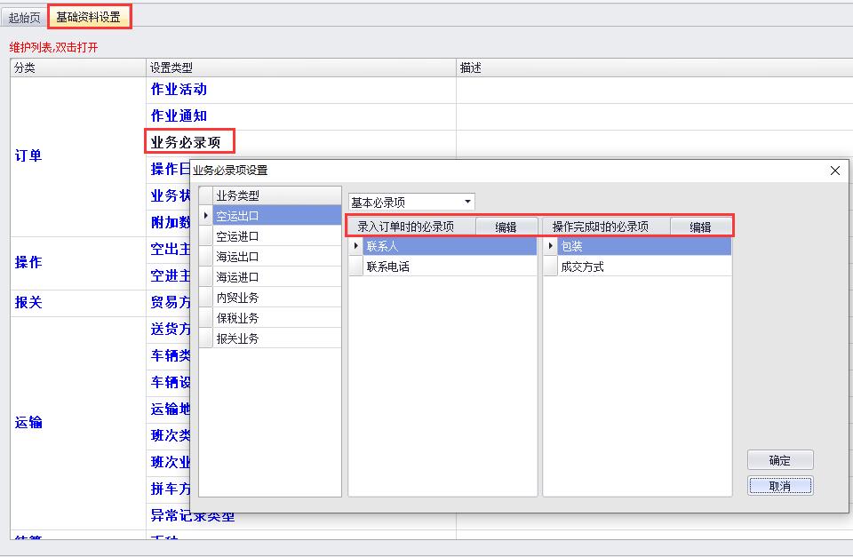 首先,在貨代系統中依次點(diǎn)擊打開(kāi)“系統”— “基礎資料設置”,雙擊打開(kāi)“業(yè)務(wù)必錄項”。以“空運出口”為例,這里包括(新增)錄入訂單時(shí)的必錄項和操作完成(也就是鎖定)時(shí)的必錄項。點(diǎn)擊“編輯”按鈕,分別添加設置錄入訂單和操作完成時(shí)所需的必錄項字段,設置好后點(diǎn)擊“確定”按鈕。如圖(1)