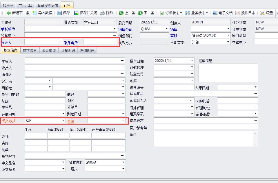 再依次點(diǎn)擊打開(kāi)“訂單”—“空運出口”,點(diǎn)擊“新建訂單”按鈕,訂單界面上藍色字段顯示的便是錄入訂單時(shí)的必錄項字段,紅色字段顯示的是操作完成時(shí)的必錄項字段。如圖(2)
