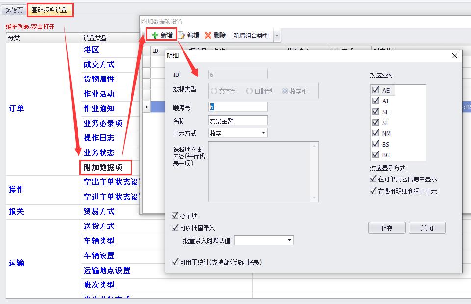 1、立刻云貨代系統中依次打開(kāi):系統-基礎資料設置,在訂單設置類(lèi)型中找到附加數據項,雙擊打開(kāi),如圖(1)