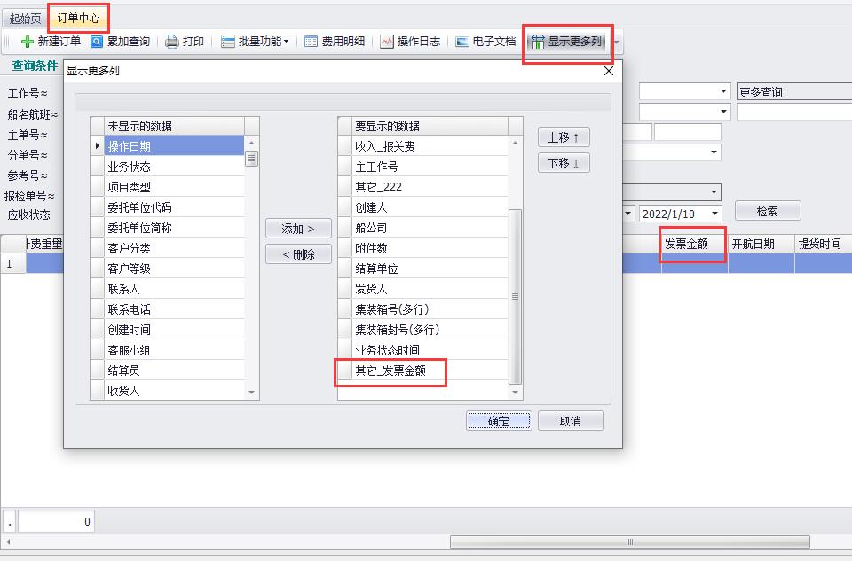 1、依次打開(kāi):訂單-訂單中心,點(diǎn)擊顯示更多列,找到在附加數據項里維護的字段,點(diǎn)擊添加確定,該字段便可添加到列表中。如圖(2)