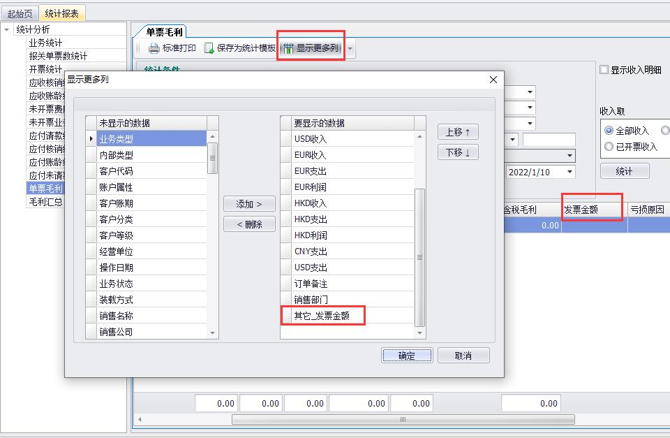 3、依次打開(kāi):報表-統計報表-單票毛利,點(diǎn)擊顯示更多列,找到在附加數據項里維護的字段,點(diǎn)擊添加確定,該字段便可添加到列表中。如圖(4)