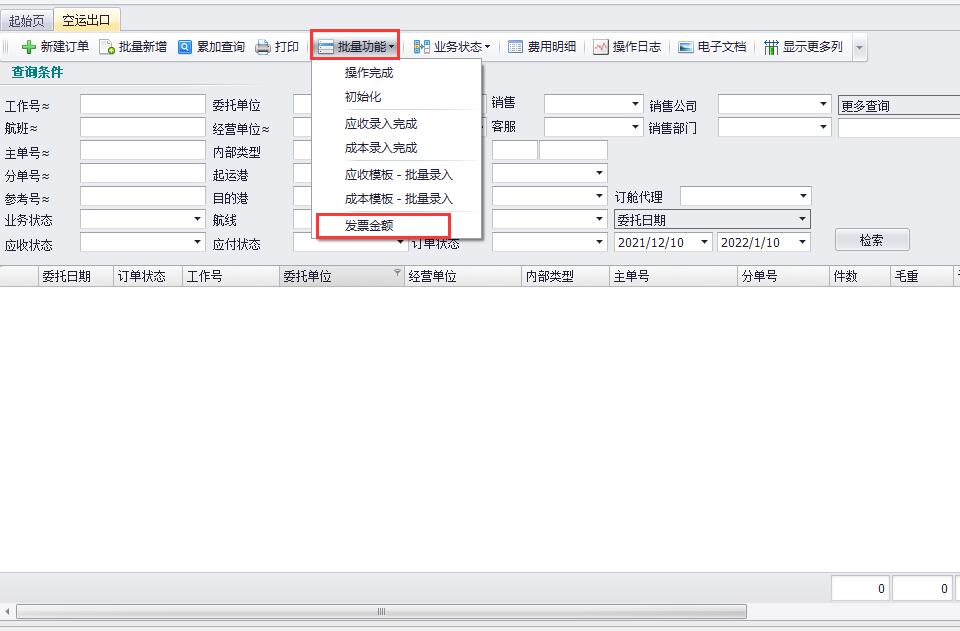 4、依次打開(kāi):訂單-空運出口(這里以空運出口為例)-批量功能,這里也是可以找到在附加數據項里維護的字段。如圖(5)