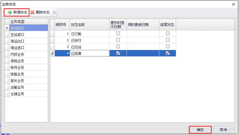立刻云貨代軟件中依次打開(kāi)【系統】—【基礎資料設置】,雙擊打開(kāi)“業(yè)務(wù)狀態(tài)”,以“空運出口”為例,新增一個(gè)“業(yè)務(wù)狀態(tài)”,然后設置是否顯示時(shí)間,是否為結尾狀態(tài),設置好后,點(diǎn)擊【確定】。如圖(1)、圖(2)