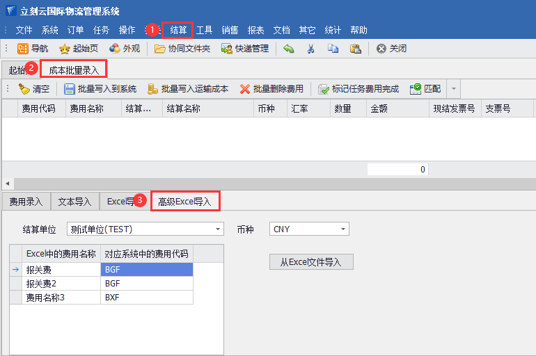 1、登錄立刻云貨代系統后,如圖(1),依次打開(kāi):“結算”-“成本批量錄入”-“高級Excel導入”,在左下方,右鍵鼠標,選擇“新增”,在“Excel中的費用名稱(chēng)”中添加一個(gè)供應商賬單表中的費用名稱(chēng),在“對應系統中的費用代碼”中,通過(guò)下拉方式,選擇一個(gè)立刻云系統內的費用代碼;