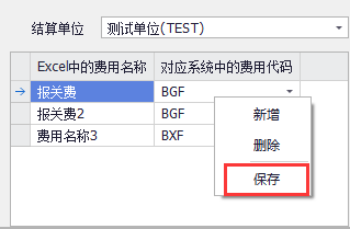 2、新增多個(gè)費用名稱(chēng)的對應關(guān)系后,如圖(2),再右鍵鼠標,選擇“保存”。