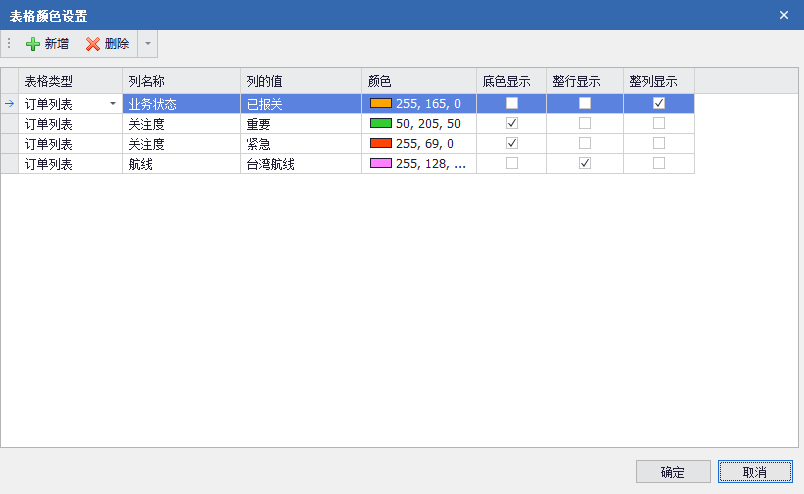 1)當列名稱(chēng)“業(yè)務(wù)狀態(tài)” 的值為:“已報關(guān)”,則將“業(yè)務(wù)狀態(tài)”整列的值的字體顏色都顯示為:橘黃色;
