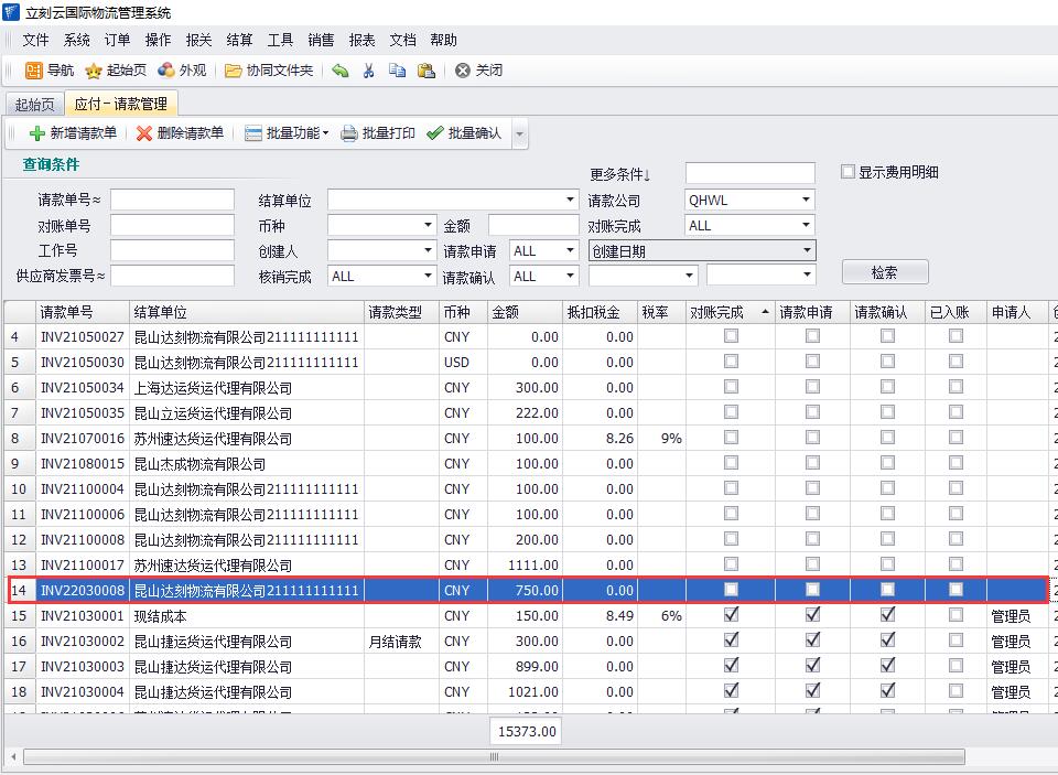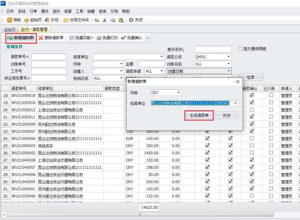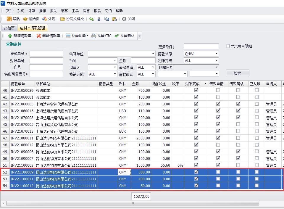 1、在立刻云貨代軟件中依次點(diǎn)擊打開(kāi)“結算-應付請款管理“,點(diǎn)擊“檢索”按鈕,比如,把這些請款單合并到一個(gè)請款單里。如圖(1)