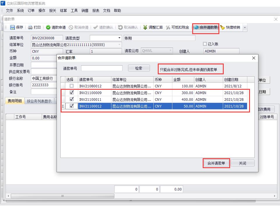 4、再次點(diǎn)擊“檢索”按鈕,此時(shí)只顯示最終合并的請款單。如圖(5)