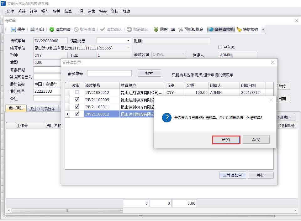 3、進(jìn)入請款單界面,點(diǎn)擊“合并請款單”按鈕,注意只能合并對賬完成但未申請的請款單,選中需要合并的請款單,點(diǎn)擊“合并請款單”按鈕,此時(shí)會(huì )有一個(gè)合并后原來(lái)的請款單會(huì )被刪除的提示,點(diǎn)擊“是”的按鈕。如圖(3)、圖(4)