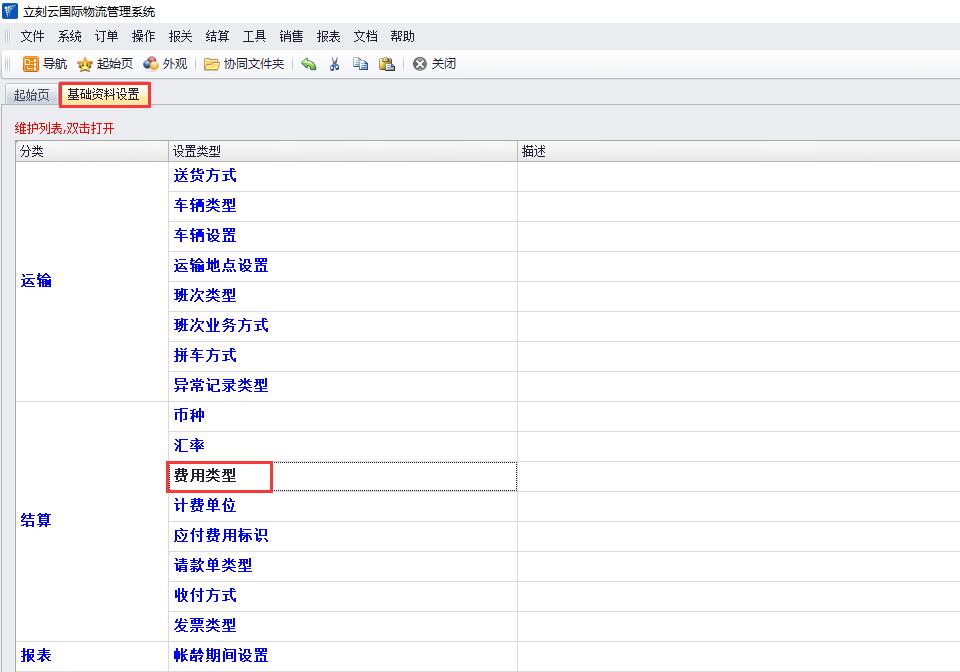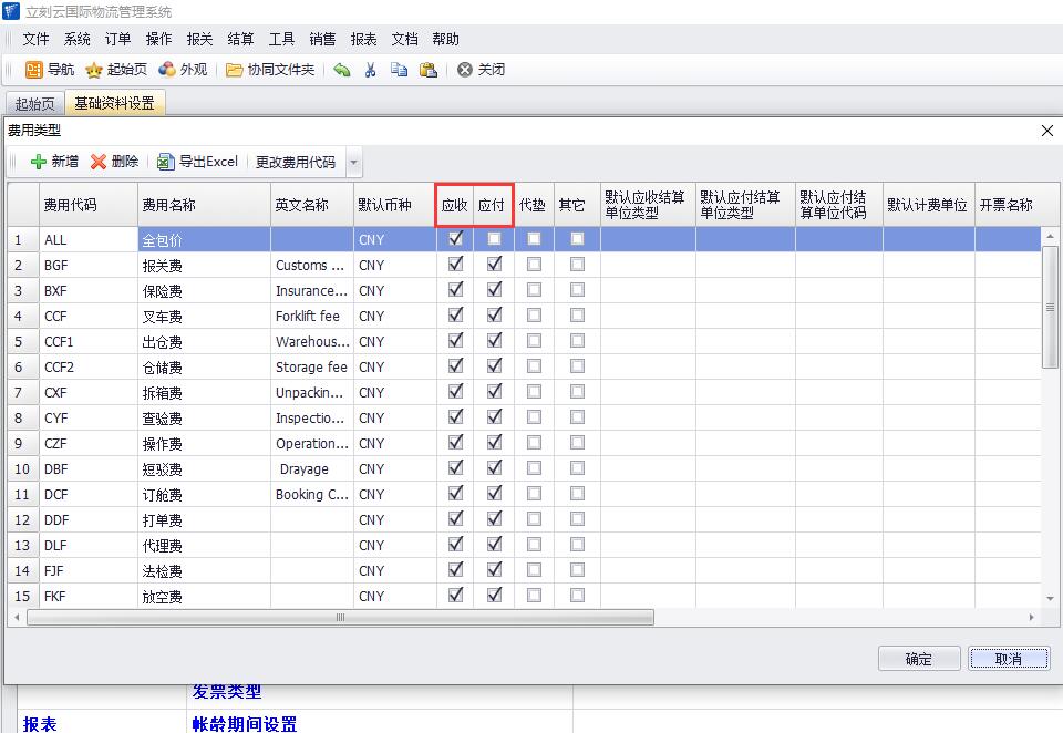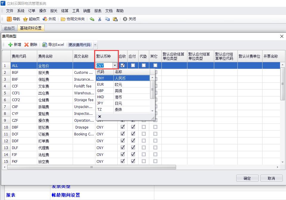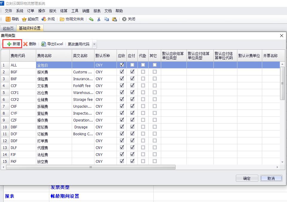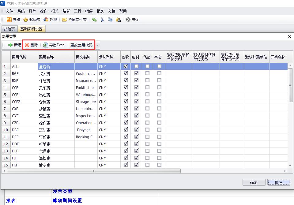 1、在立刻云貨代系統中依次打開(kāi)“系統-基礎資料設置”,雙擊打開(kāi)“費用類(lèi)型”,點(diǎn)擊“新增”按鈕,費用代碼就是費用名稱(chēng)的拼音首字母縮寫(xiě),如果維護了英文名稱(chēng),則后續生成的英文賬單上會(huì )顯示英文費用名稱(chēng),若是系統切換成了英文版,也可以直接顯示英文費用名稱(chēng)。如圖(1)、圖(2)