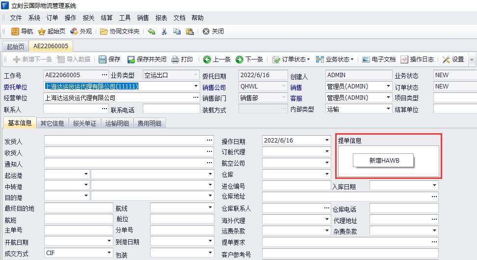 立刻云貨代系統以空出提單為例,依次打開(kāi)【訂單】—【空運出口】,點(diǎn)擊【檢索】按鈕,雙擊打開(kāi)一個(gè)沒(méi)有制作提單的訂單,在 “提單信息”處右擊可以新增提單。如圖(1)