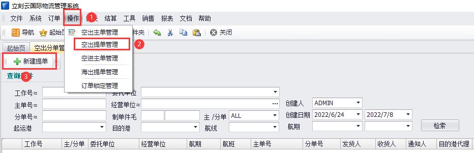 也可以依次點(diǎn)擊打開(kāi)①【操作】—②【空出提單管理】,點(diǎn)擊③【新建提單】按鈕。如圖(2)