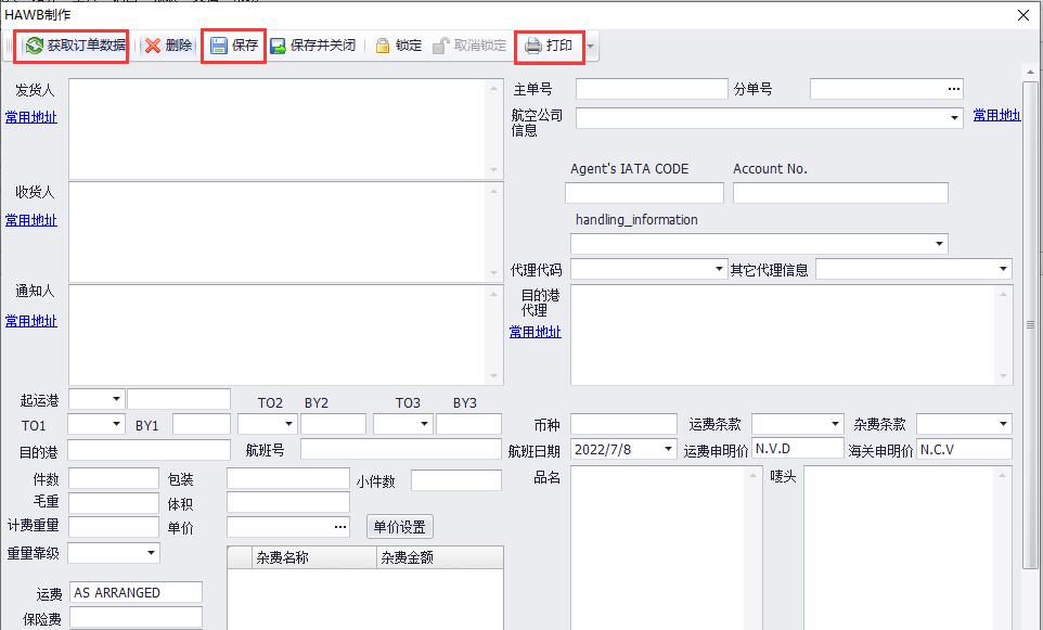 輸入對應的工作號,選擇好對應的“開(kāi)航日期”,點(diǎn)擊【檢索】按鈕生成提單,在提單編輯界面,點(diǎn)擊左上方的【獲取訂單數據】按鈕,即可抓取訂單中的基本信息內容,沒(méi)有獲取的內容可以直接錄入。維護好內容后,點(diǎn)擊【保存】,點(diǎn)擊【打印】按鈕,即可打印提單。如圖(3)、圖(4)