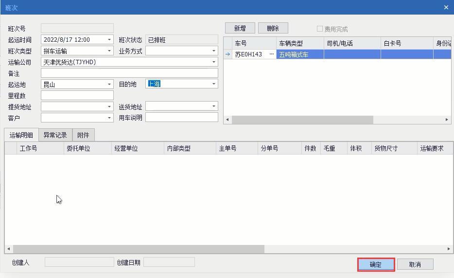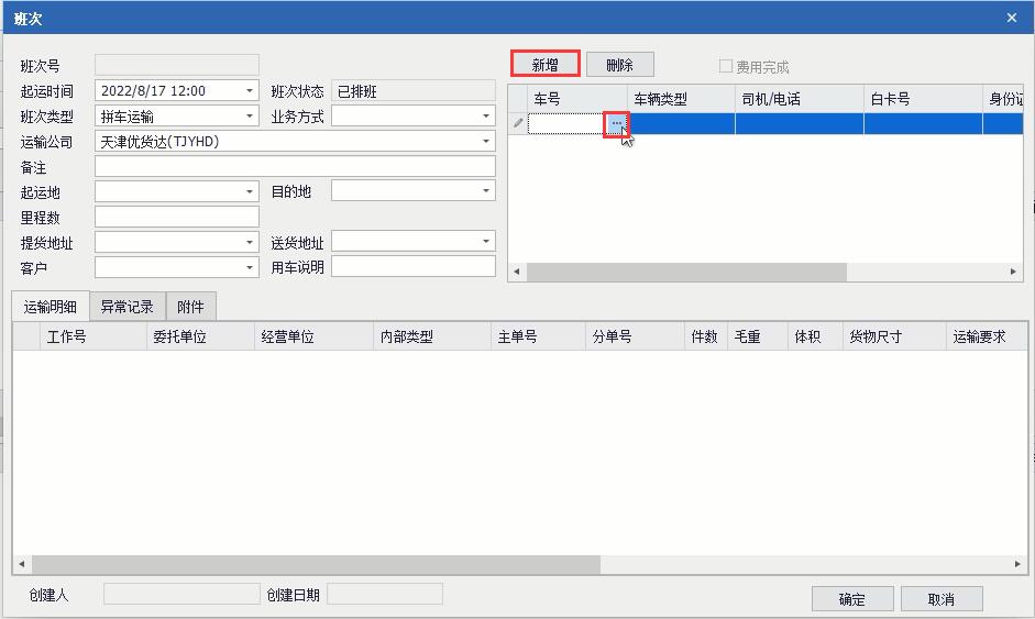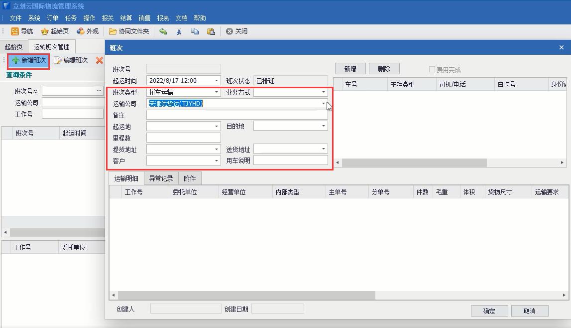 首先我們需要建立班次,登錄立刻云貨代軟件后,依次點(diǎn)擊:【操作】-【運輸班次管理】-【新增班次】,在彈出界面選擇:起運時(shí)間、班次類(lèi)型、運輸公司、起運地、目的地等,然后新增并選擇本班次運輸使用到的車(chē)輛信息,最后點(diǎn)擊:【確定】;如圖(1)、圖(2)、圖(3)、圖(4)