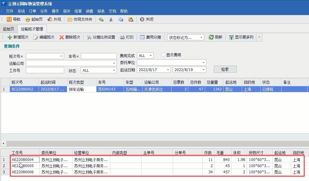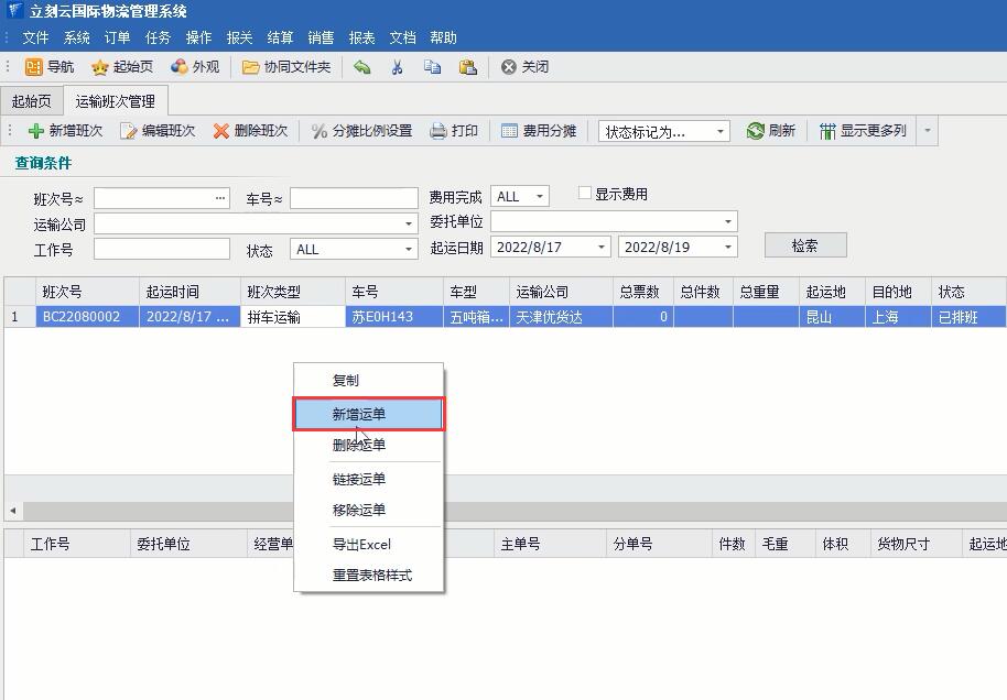 1、然后我們需要在班次中關(guān)聯(lián)運單,先選中剛剛建立的班次,然后在下方位置,右鍵鼠標,這里可以選擇【新增運單】或【鏈接運單】,新增運單指的是直接到訂單,選中訂單后直接建立運單并加入到這個(gè)班次中,鏈接運單指的是訂單中已經(jīng)存在運單,通過(guò)系統檢索出這些運單,將運單加入到這個(gè)班次中。