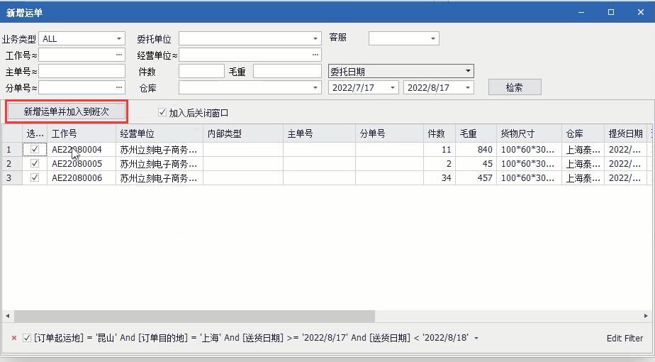 2、本次我們以【新增運單】為例,點(diǎn)擊【新增運單】按鈕后,在彈出窗口中可以按照“訂單起運地”、“訂單目的地”、“提貨日期”、“送貨日期”等進(jìn)行篩選,篩選完畢后,右鍵鼠標全選訂單,然后點(diǎn)擊:【新增運單并加入到班次】,這樣就呈現出一個(gè)班次中有多個(gè)運單了。如圖(5)、圖(6)、圖(7)