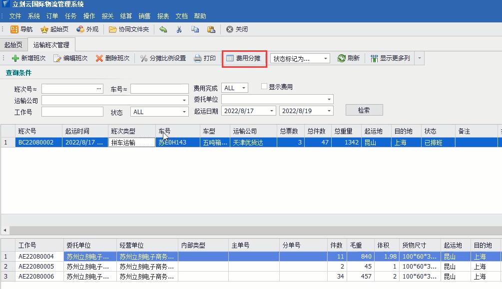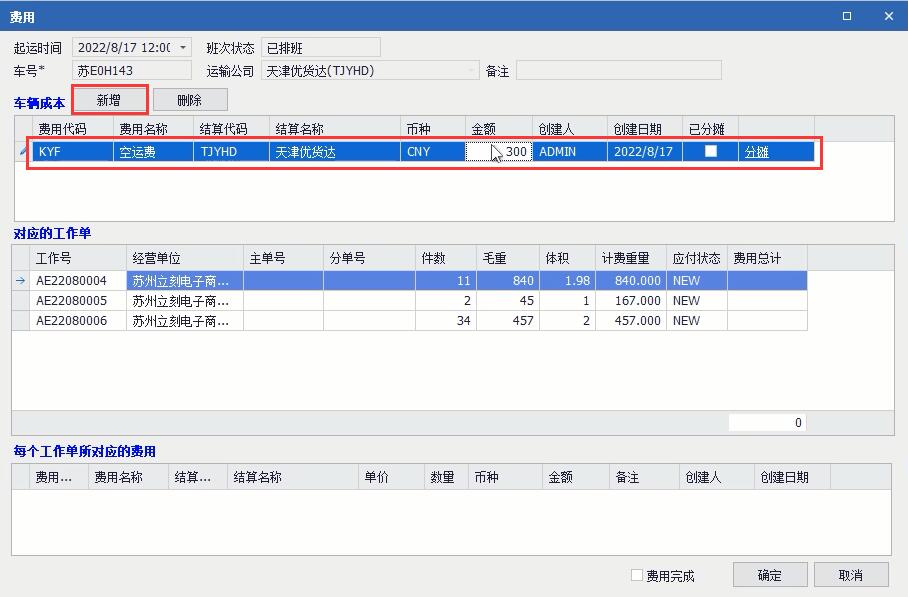 1、選中某個(gè)班次后,點(diǎn)擊:【費用分攤】按鈕,在彈出的【費用】界面,可以新增本班次產(chǎn)生的車(chē)輛成本,比如:“運費”,結算單位默認為本班次所對應的“運輸公司”,然后錄入“金額”。如圖(8)、圖(9)