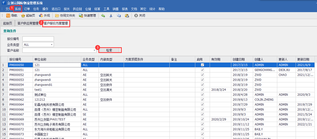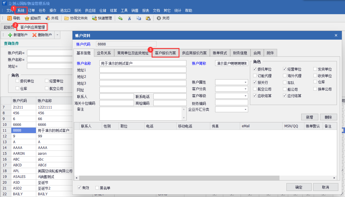 1、在立刻云貨代系統中依次點(diǎn)擊【系統】-【客戶(hù)供應商管理】,檢索并雙擊打開(kāi)某個(gè)客戶(hù),點(diǎn)擊【客戶(hù)報價(jià)方案】選項卡;如圖(1)