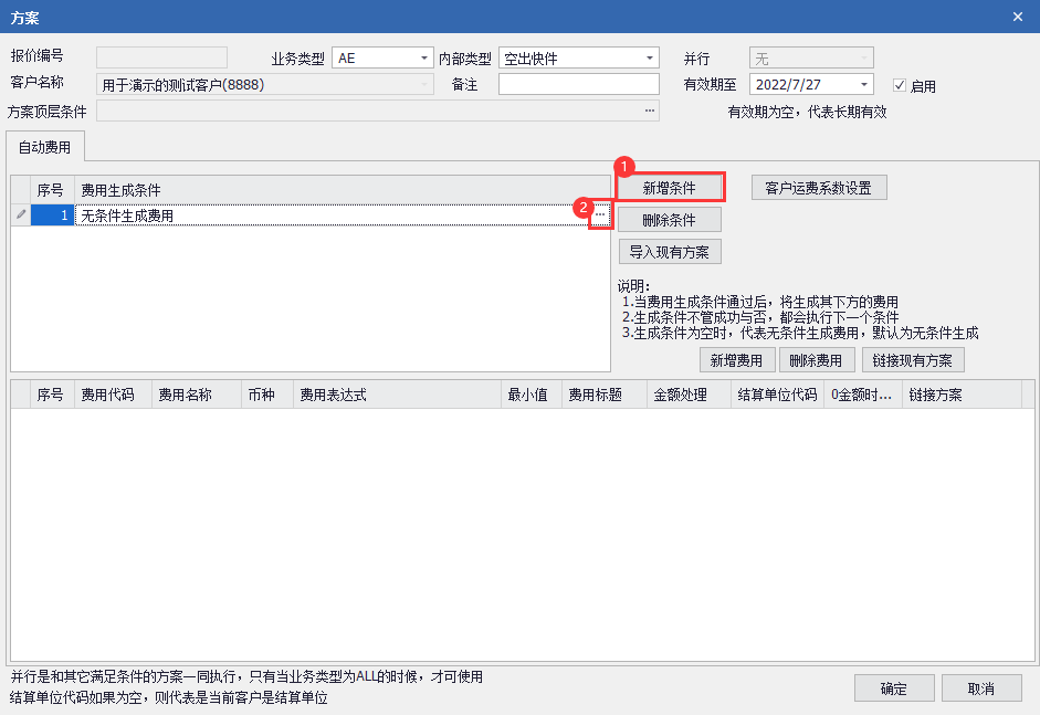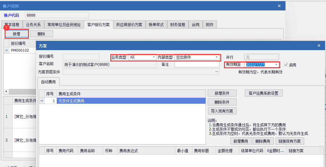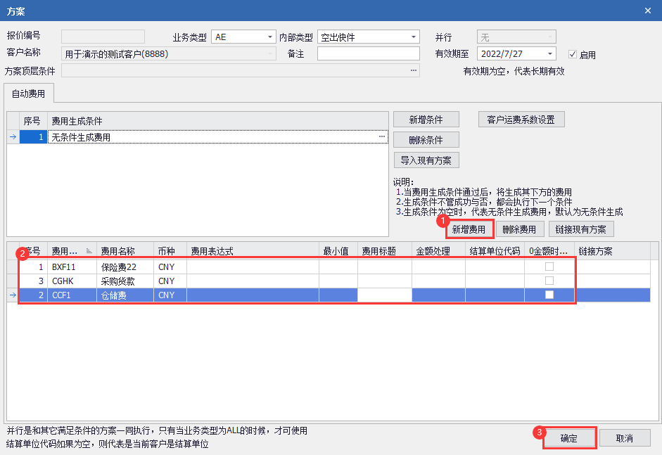6、點(diǎn)擊【新增費用】,可配置滿(mǎn)足“費用生成條件”的費用及費用計算公司,配置好“客戶(hù)報價(jià)方案”后,點(diǎn)擊【確定】保存方案;如圖(6)