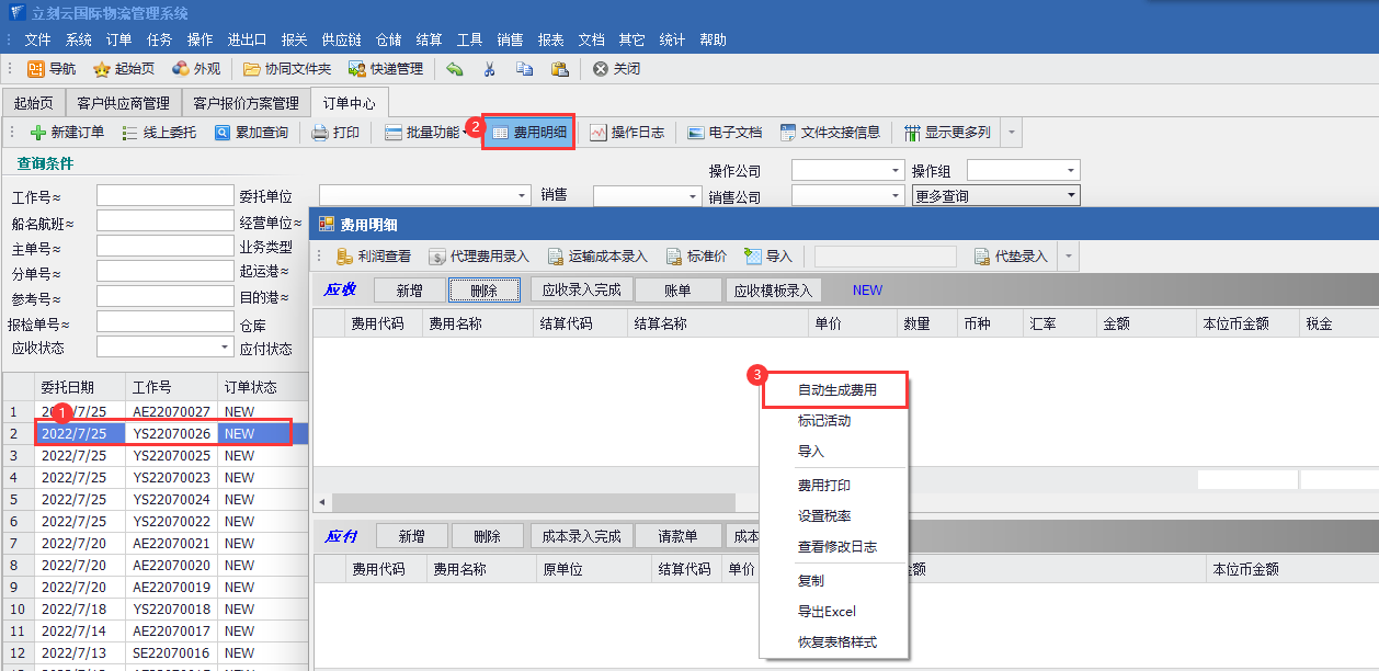 8、單票訂單自動(dòng)生成費用:打開(kāi)已有報價(jià)方案的客戶(hù)訂單,在“費用明細”應收費用錄入區域,右擊點(diǎn)擊【自動(dòng)生成費用】;如圖(8)
