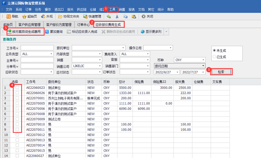 9、多票訂單自動(dòng)生成費用:依次點(diǎn)擊【工具】-【應收報價(jià)費用生成】,點(diǎn)擊【檢索】,勾選需要根據“客戶(hù)報價(jià)方案”自動(dòng)生成應收費用的訂單,點(diǎn)擊【按方案自動(dòng)生成費用】;如圖(9)