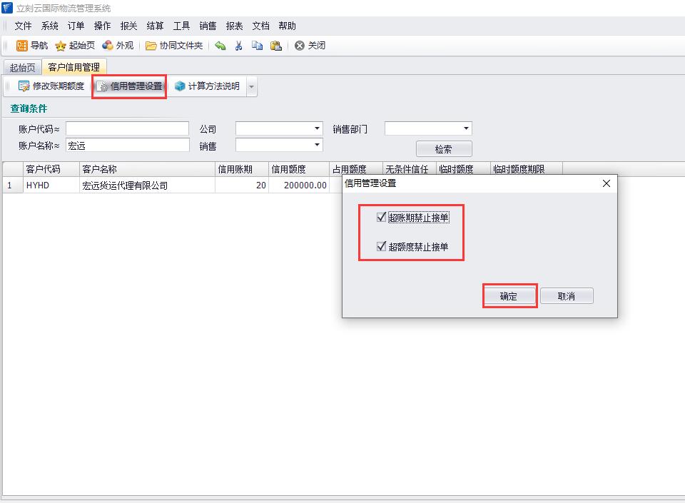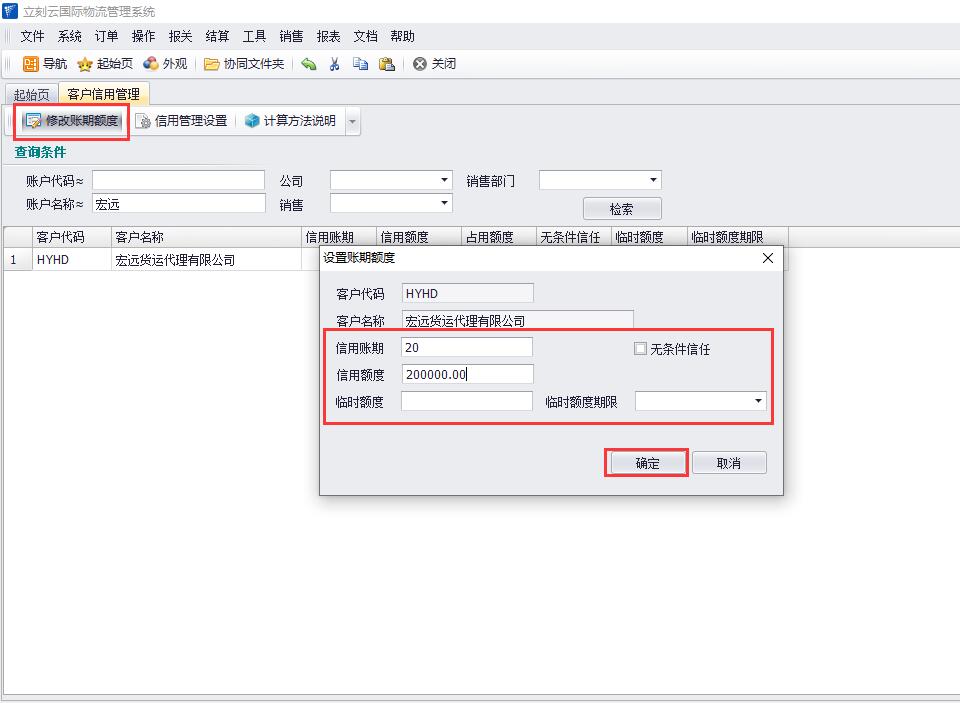 1、立刻云貨代軟件中依次點(diǎn)擊“工具—客戶(hù)信用管理”,先輸入查詢(xún)條件,再點(diǎn)擊“檢索”按鈕,選中需要設置的客戶(hù),點(diǎn)擊“修改賬期額度”按鈕,在此界面設置好信用賬期、信用額度等信息后點(diǎn)擊“確定”按鈕。如圖(1)