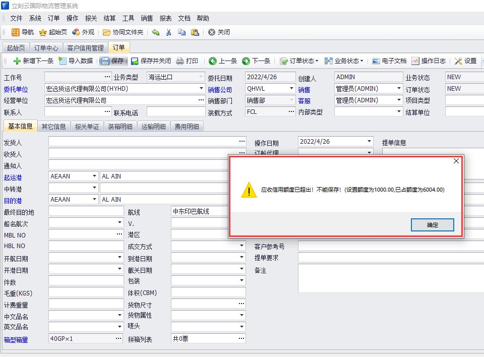 4、下面我們以空運出口為例,看下效果,依次點(diǎn)擊“訂單—空運出口”,點(diǎn)擊“新建訂單”按鈕,以該客戶(hù)建立一個(gè)新訂單,填好相關(guān)信息,點(diǎn)擊“保存”按鈕,此時(shí)便會(huì )有相關(guān)超期超額提示,不可接單。如圖(4)