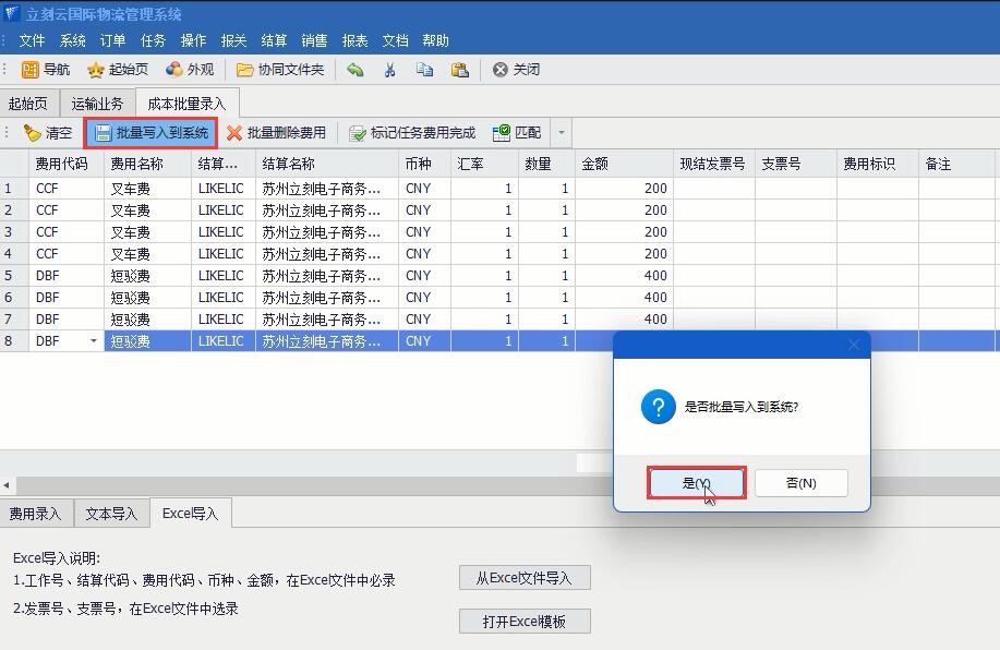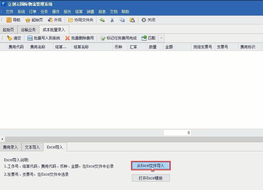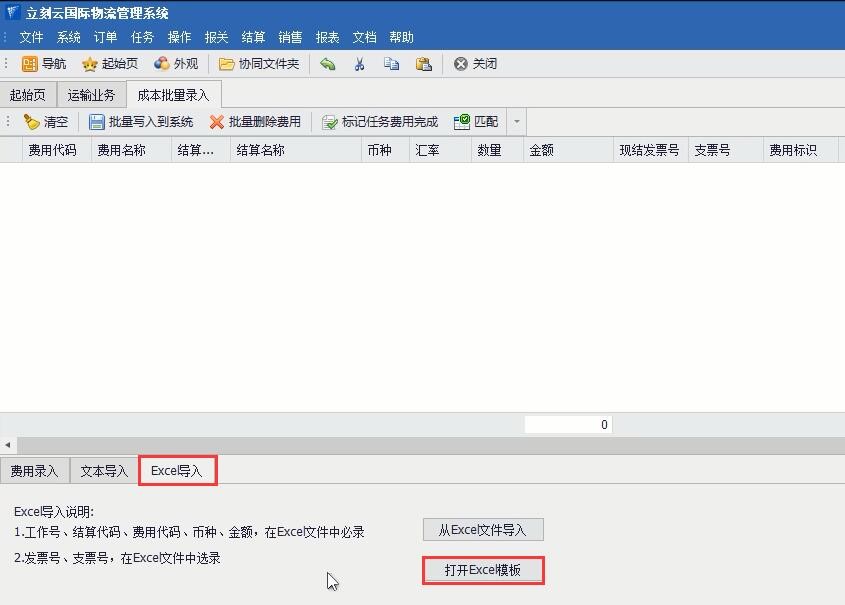 登錄立刻云貨代系統后,依次點(diǎn)擊【結算】-【成本批量錄入】,在此界面下,可以通過(guò)內置的Excel模板,導入應付的成本費用,在Excel導入模板中維護好【工作號】、【結算代碼】、【費用代碼】、【幣種】、【金額】、【數量】,確認無(wú)誤后關(guān)閉表格。如圖(1)、圖(2)、圖(3)