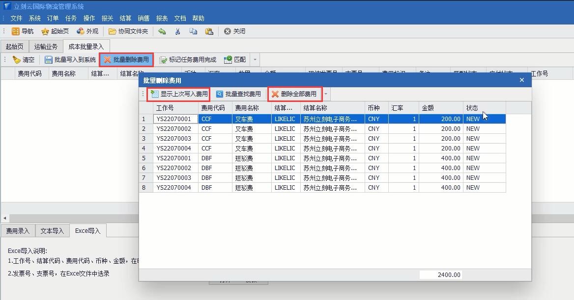 如果這一批次導入有誤的,還可以點(diǎn)擊【批量刪除費用】-【顯示上次寫(xiě)入費用】-【刪除全部費用】。如圖(6)