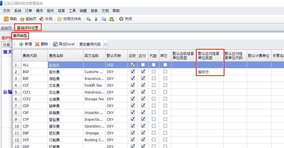 2)“報關(guān)費”對應的“默認應付結算單位類(lèi)型”設置為:“報關(guān)行”;