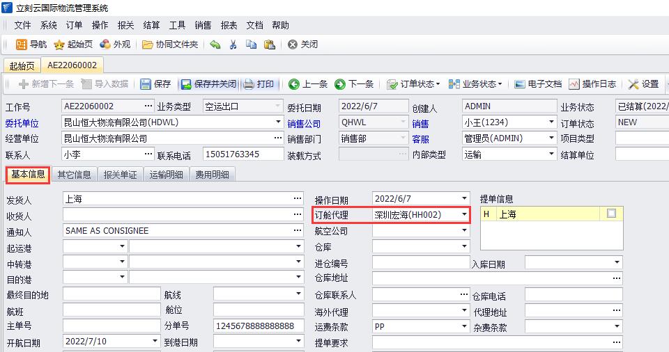 1、如圖(2),在訂單的“基本信息”界面,選擇:“訂艙代理”是某家供應商公司;