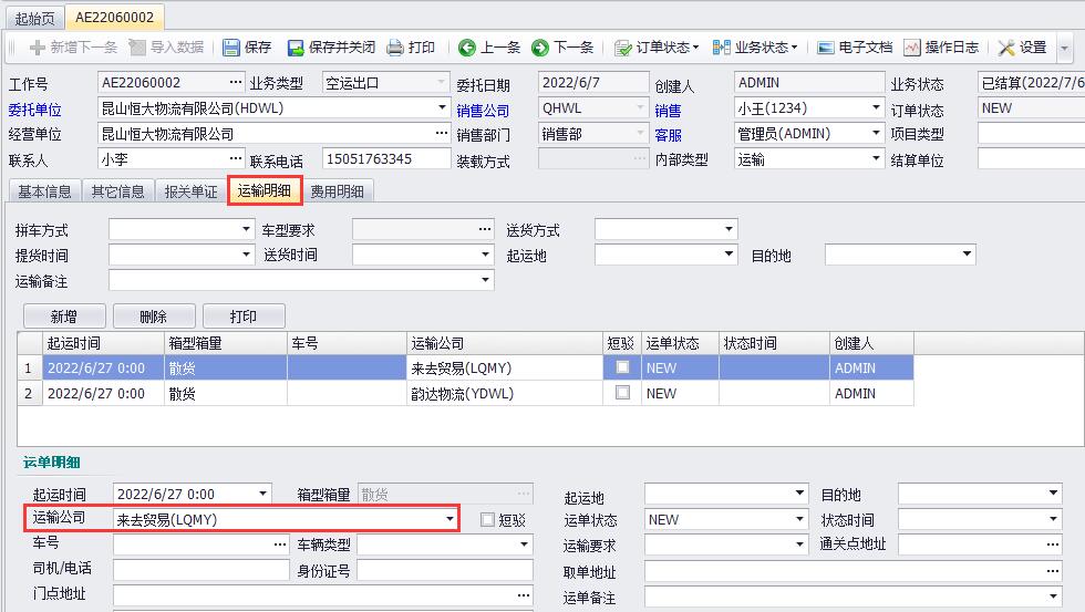 3、如圖(4),在訂單的“運輸明細”界面,新增一個(gè)運單,然后選擇:“運輸公司”是某家供應商公司;