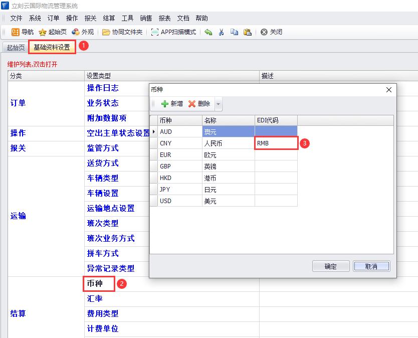 立刻云貨代系統中依次打開(kāi)【系統】—【基礎資料設置】—【幣種】,需要設置財務(wù)系統中對應的幣種,比如在對應人民幣的“EDI代碼”一欄中輸入“RMB”,設置好后點(diǎn)擊【確定】按鈕。如圖(1)