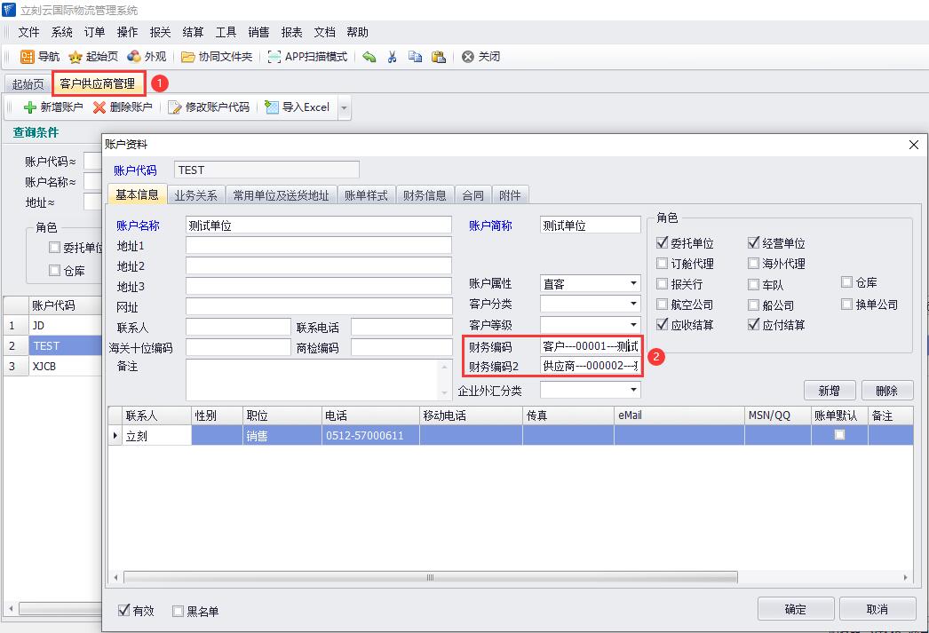 依次打開(kāi)【系統】—【客戶(hù)供應商管理】,雙擊某個(gè)客戶(hù),根據具體情況錄入財務(wù)編碼,需要注意的是上方這一欄“財務(wù)編碼”是錄入客戶(hù)核算項目,下方這一欄“財務(wù)編碼2”是錄入供應商核算項目,若既是客戶(hù)又是供應商,則兩欄都需要錄入,錄入內容的格式為:“客戶(hù)—00001—蘇州立刻電子商務(wù)有限公司”或“供應商—000002—蘇州立刻電子商務(wù)有限公司”。如圖(2)
