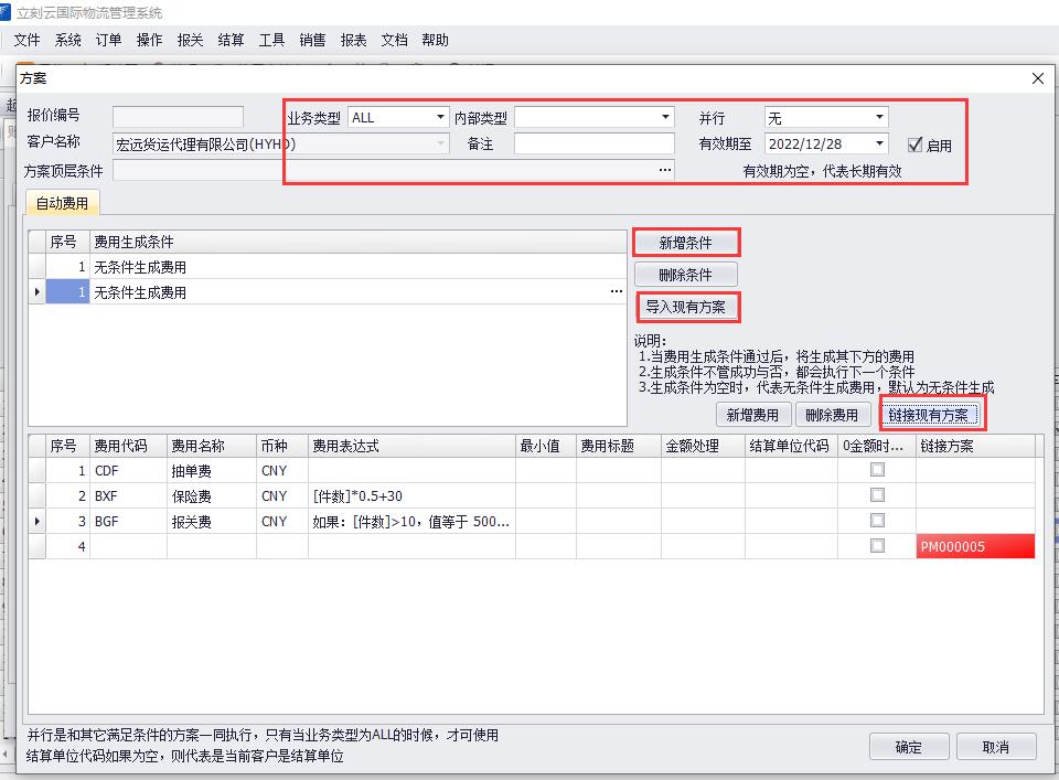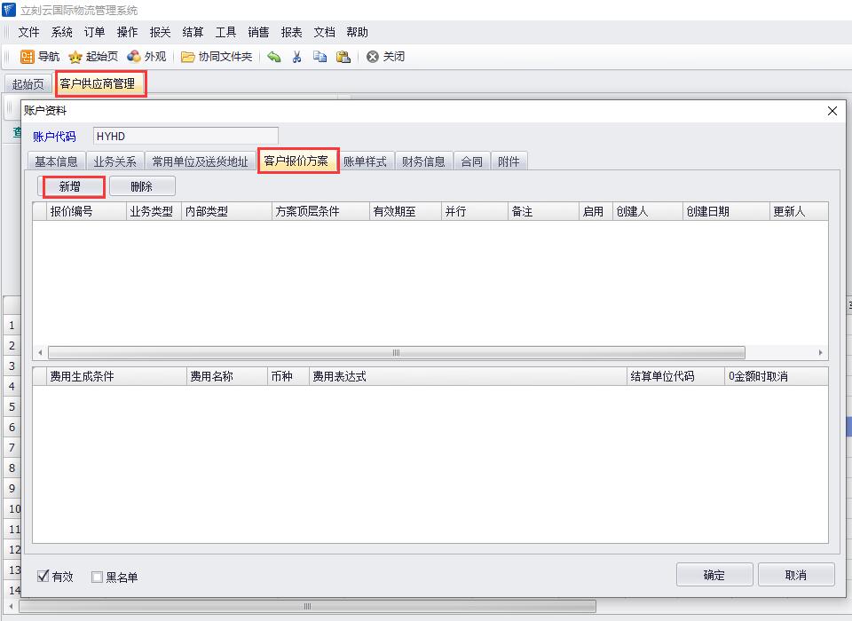 1、在立刻云貨代系統中依次點(diǎn)擊“系統—客戶(hù)供應商管理”,點(diǎn)擊“檢索”按鈕,雙擊打開(kāi)某個(gè)賬戶(hù),點(diǎn)擊“客戶(hù)報價(jià)方案”按鈕,再點(diǎn)擊“新增”按鈕,可以設置對應的業(yè)務(wù)類(lèi)型,有效時(shí)間等,點(diǎn)擊“新增條件”按鈕,可以添加多個(gè)費用生成條件,若之前有設置過(guò)方案,可以直接點(diǎn)擊“導入現有方案”按鈕,直接使用,需要注意的是,當被導入的現有方案有所改動(dòng)時(shí),當前界面的方案不會(huì )被同步修改,反之亦然。點(diǎn)擊“鏈接現有方案”按鈕,可以鏈接已有方案直接使用,需要注意的是,當被鏈接的現有方案有所改動(dòng)時(shí),當前界面方案也會(huì )按改動(dòng)后方案執行。如圖(1)、圖(2)