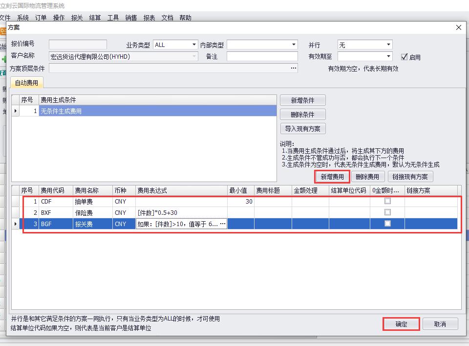 2、點(diǎn)擊“新增費用”按鈕,可以設置多條費用,這里分別設置三種不同類(lèi)型的費用為例,抽單費我們直接使用“最小值”,填寫(xiě)一個(gè)固定值即可,其他兩條費用我們用公式來(lái)表示,三條費用都設置好后,我們點(diǎn)擊“確定”按鈕。如圖(3)