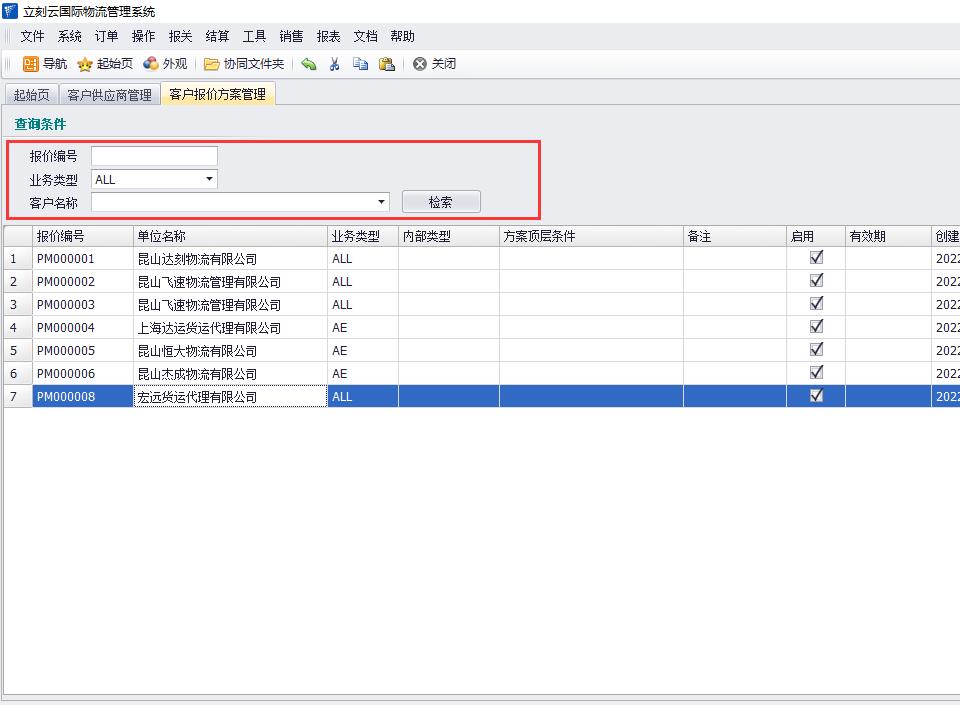 3、然后,依次點(diǎn)擊“系統—客戶(hù)報價(jià)方案管理”,可以通過(guò)報價(jià)編號、業(yè)務(wù)類(lèi)型、客戶(hù)名稱(chēng)來(lái)檢索查詢(xún)。如圖(4)