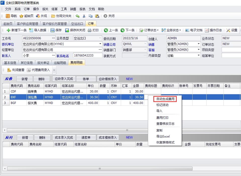 4、以空運出口為例,依次點(diǎn)擊“訂單—空運出口”,點(diǎn)擊“新建訂單”按鈕,委托單位選擇剛剛設置的賬戶(hù),填寫(xiě)好訂單的基本資料后,點(diǎn)擊“保存”按鈕,然后轉到“費用明細”界面,在應收處鼠標右鍵,選擇“自動(dòng)生成費用”選項,即可按照對應的報價(jià)方案,自動(dòng)生成費用。如圖(5)