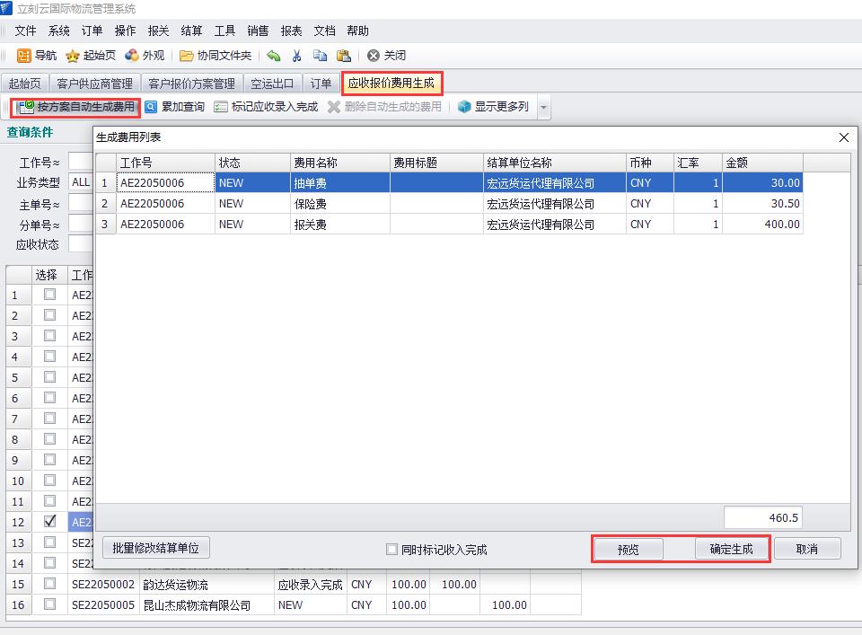 5、也可以依次點(diǎn)擊“工具—應收報價(jià)費用生成”,選中需要按照方案生成費用的訂單,點(diǎn)擊“按方案自動(dòng)生成費用”按鈕,將自動(dòng)生成費用,預覽無(wú)誤后,點(diǎn)擊“確定生成”即可。如圖(6)