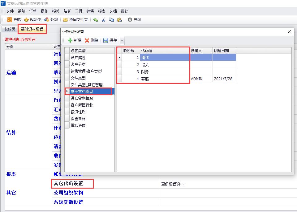 1、立刻云貨代系統中依次點(diǎn)擊打開(kāi)“系統-基礎資料設置“,雙擊打開(kāi)”其它代碼設置“,選中點(diǎn)擊”電子文檔類(lèi)型“,點(diǎn)擊”新增“按鈕,新增所需內容,編輯好后,點(diǎn)擊”保存“按鈕。如圖(1)