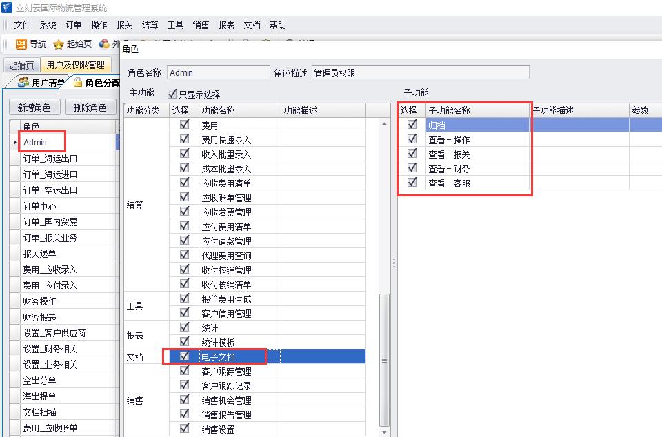 2、依次點(diǎn)擊“系統—用戶(hù)及權限管理“,點(diǎn)擊”角色分配“按鈕,在對應的角色里,勾選我們剛剛新增的電子文檔類(lèi)型。如圖(2)
