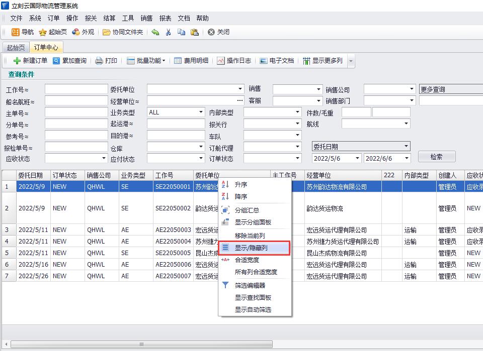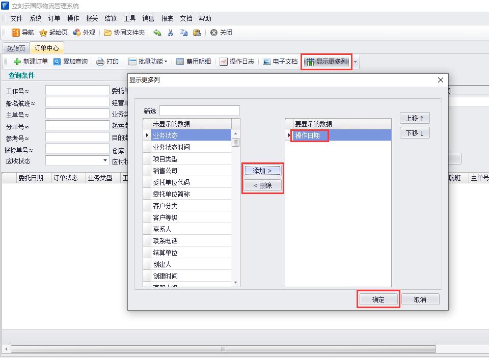 1、在立刻云貨代軟件中依次打開(kāi)“訂單-訂單中心”,在訂單中心頁(yè)面找到“顯示更多列”按鈕,點(diǎn)擊進(jìn)入編輯頁(yè)面,在“未顯示的數據”中選擇需要展現到列表中的數據,點(diǎn)擊“添加”按鈕添加,也可以刪除或者上移、下移調整位置,添加好后點(diǎn)擊“確定”按鈕。此時(shí),我們剛剛添加的字段,就顯示在列表中了。如圖(1)、圖(2)
