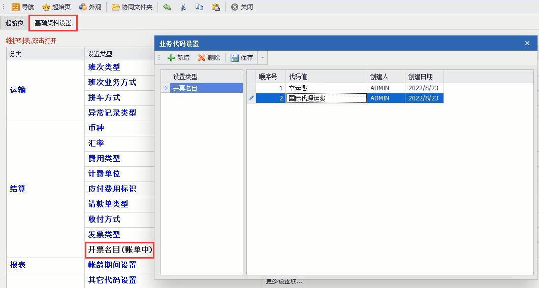 第一步,依次點(diǎn)擊:【系統】-【基礎資料設置】-【開(kāi)票名目】,先維護常用的開(kāi)票名目,比如:空運費、國際代理運費等等。如圖(2)