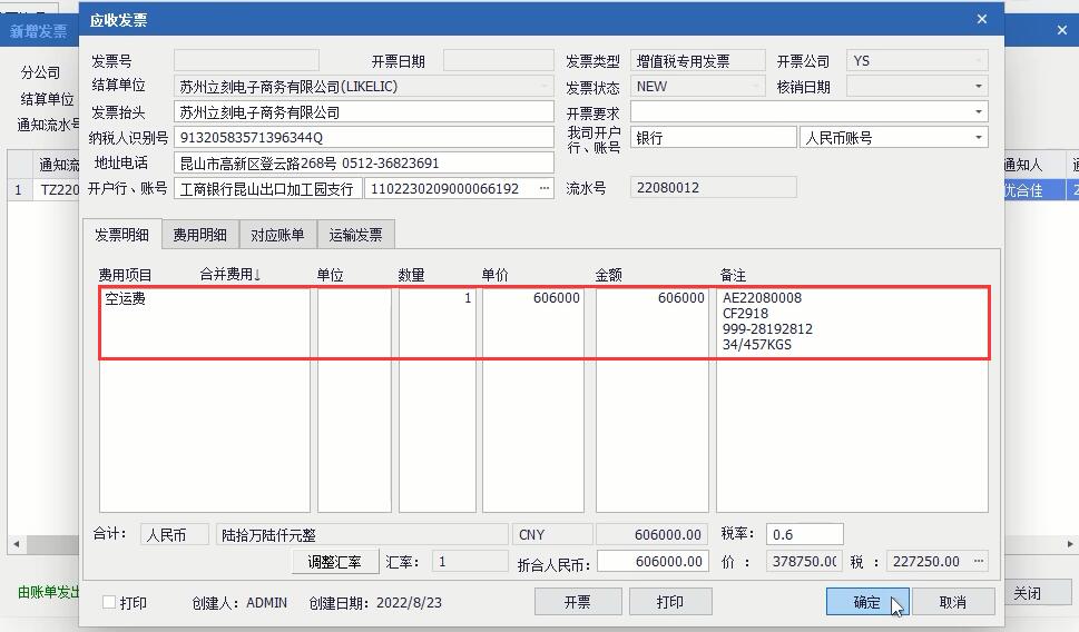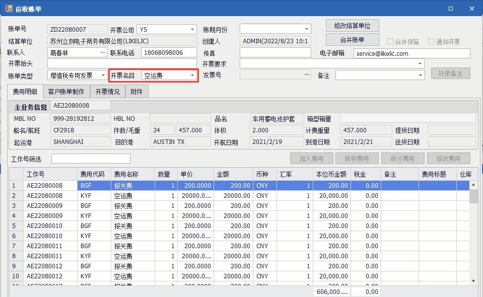 在立刻云貨代軟件默認的設置情況下,生成發(fā)票時(shí),系統將自動(dòng)根據對應賬單內的“費用名稱(chēng)”進(jìn)行費用的合并。