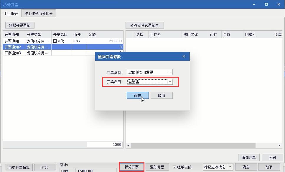 第二步,依次點(diǎn)擊:【結算】-【應收賬單管理】,找到一個(gè)賬單,雙擊打開(kāi),在【開(kāi)票名目】中選擇一個(gè)名目,然后點(diǎn)擊【通知開(kāi)票】,如果是月結賬單,也可以點(diǎn)擊:【拆分開(kāi)票】,在【拆分開(kāi)票】的界面,可以雙擊【開(kāi)票類(lèi)型】、【開(kāi)票名目】,調整每一個(gè)開(kāi)票通知的開(kāi)票類(lèi)型和名目。如圖(3)、(4)