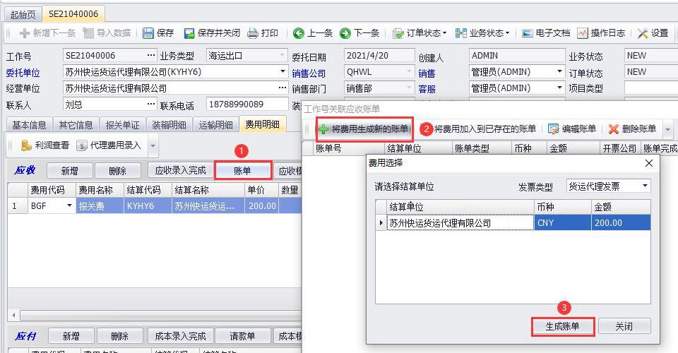 在立刻云貨代軟件中的訂單”費用明細”界面,可以點(diǎn)擊①【賬單】-②【將費用生成新的賬單】-③【生成賬單】制作單票訂單的賬單。如圖(1)