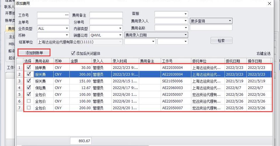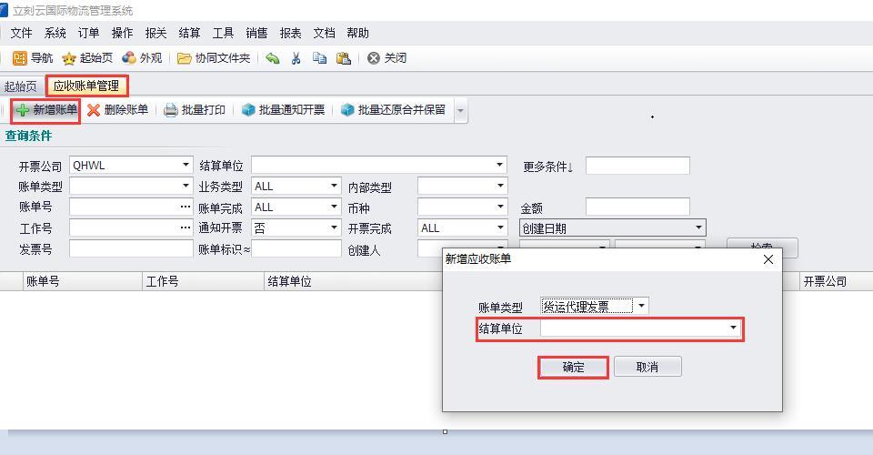 在【結算】-【應收賬單管理】界面,可以點(diǎn)擊【新增賬單】按鈕,選擇結算單位后,系統會(huì )默認顯示所有未做賬單的此客戶(hù)費用,檢索后全選添加到賬單即可。如圖(2)、圖(3)
