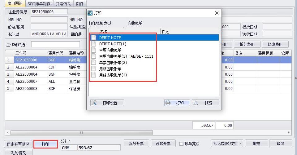 單票賬單,可以點(diǎn)擊賬單界面左下角的【打印】,打出各種格式的賬單,多票賬單或月結賬單。如圖(4)