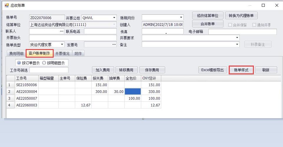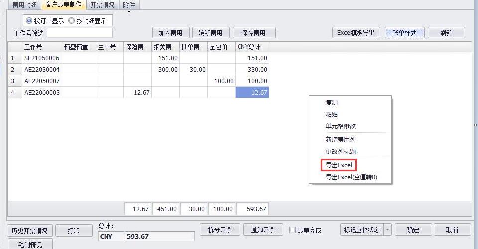 也可以點(diǎn)擊“客戶(hù)賬單制作”選項,然后在“賬單樣式”中自行調整需要的字段,最后右鍵導出EXCEL格式的月結賬單。如圖(5)、圖(6)、圖(7)